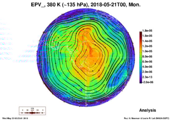 Ertel’s potential vorticity (EPV) generated from analyzed wind data at the 380 K potential temperature level, i.e., in the Antarctic stratosphere at approximately 14 km altitude. Plot shows EPV on 21 May 2018, in units of (see []).