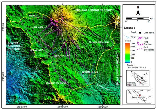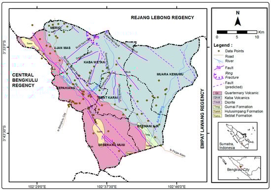Regional geological map and the existence of a fault of Kepahiang regency, Bengkulu province, Indonesia (modified from Gafoer et al. [] and Irwanto et al. []).