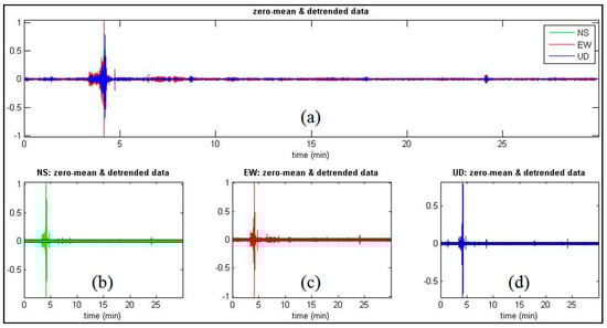 Examples of microtremor recording signals obtained in the field: (a) microtremor recording of the combined three components of NS, EW, and UD; (b) microtremor recording of the NS component; (c) microtremor recording of EW components; (d) microtremor recording of UD components.