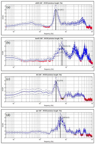 Example of the spectrum of data processing results to get the fg and Ag value at data points with the predominant frequency and amplification respectively: (a) aih05 on (4.1 Hz and 6.1); (b) ban03 on (6.8 Hz and 4.1); (c) kl3 on (4.2 Hz and 5.9); (d) tg1 on (6.0 Hz and 6.3).