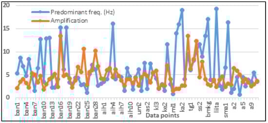 The amplification factor or HVSR spectrum ratio in the study sites varied from 1.5 to 13.5. The ratio of HVSR spectra above hard rock shows response, with smaller peaks at higher frequencies. For the measurement point located above the thick sediment, it shows a sharper peak at a lower frequency. The HVSR ratio curve shows the contrast of impedance between the soft soil layers above the bedrock []. This study does not show a relationship between the predominant frequency and the resulting amplitude. Different amplification values may be found at the same frequency, as shown in Figure 6. According to Warnana [], the distribution of high amplification factors across the measurement area indicates that the amplification factor is not determined only by topographic effects but also by some other factors, such as local geological factors. Indeed we need to be aware of areas with low predominant frequency values and high amplification values in seismic hazard analysis related to soft sediment thickness. The thick, soft sediment will affect the duration of the seismic waves that propagate at the site and will increase the amplitude of the wave, which can lead to damage to buildings.