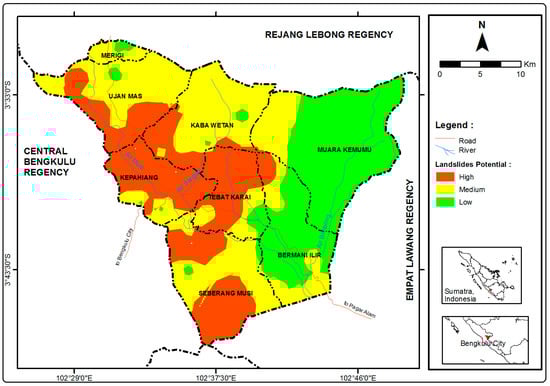 The results of our study show that Kepahiang regency, Bengkulu province, Indonesia has areas of high landslide potential due to the Sumatran fault movement of the Musi active segment. In particular there is a risk of slopes collapse and of landslides potentially covering populated areas, highways, infrastructure facilities, thereby causing mass casualties. Indeed, according to earthquake records from the United States Geological Service [], on 15 December 1979 there was a devastating earthquake (Ms = 6.6) with a depth of 33 km around the Sumatran fault segment of Musi, causing fissures and major landslides and nearly 500 houses were destroyed []. The most damaged areas are in Daspetah, Ujan Mas subdistrict. In particular, we have classified landslide potential in Kepahiang regency into three categories, namely low, medium and high potential. Areas that have high potential, such as Ujan Mas, Kepahiang, Kabawetan, Tebat Karai, Bermani Ilir, and Seberang Musi subdistricts are at greater risk from landslide disasters, especially in densely populated areas. Hence it is important that buildings and infrastructure are built in this area to resist earthquake shocks and that they are not constructed in areas of high landslide potential.