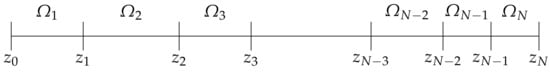 - Divide the domain into a finite number of sub-domains. We consider , where are arbitrary real numbers and (see Figure 2). We call them decomposition points. We define each sub-domain as , and we have: