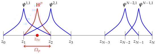 Figure 3. Multi-scale basis functions and local primary field . is the domain of the local primary field.Extending the local primary field to the entire domain with zero, we have . The local primary field has a discontinuous flux at and . For the special case when the source is located at one decomposition point, we consider , whereThe displacement is an arbitrary choice. We use a small number compatible with our grid size, but other values are also valid. - Solve pairs of local problems. We consider , . For each sub-domain , we solve a pair of local problems which correspond to a discontinuous flux at the node . Specifically, the flux of the first local problem has a jump equal to , and the flux of the second local problem has a jump equal to . The local functions solve the following variational problems:where , and corresponds to the jump of the flux of the solutions at . Specifically:Similarly to the local primary field, we consider the extension by zero of the local solutions on , and we have . We denote the solutions of these local problems as multi-scale basis functions. We define the following space of multi-scale basis functions: