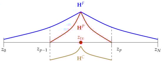 We consider each layer as a sub-domain. Therefore, the decomposition points are the boundaries of our layers. By doing so, we can evaluate the local primary fields in sub-domains which have smoothly varying materials. In particular, if we assume that the layer properties are homogeneous, the fundamental solution in (65) is independent of the tool position. Moreover, the correction basis functions are independent of the tool position. Consequently, instead of solving one primary field for each tool position, we find one fundamental field and four correction basis functions per layer. This simplification allows us to increase the speed of the method almost by a factor equal to the number of tool positions.