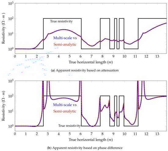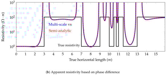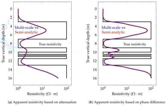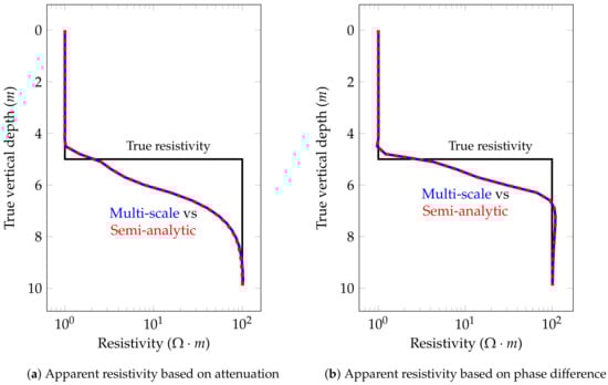 The results in terms of apparent resistivities for this model problem for and deviated wells are shown in Figure 16 and Figure 17, respectively. Again, the numerical and semi-analytic solutions coincide.