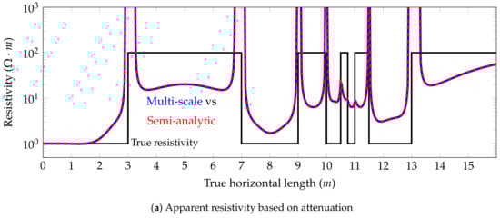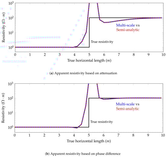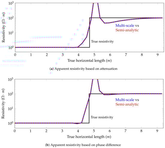 We consider the logging instrument described in Figure 6. Figure 7 through Figure 9 show the apparent resistivities (logs) for different dip angles. The distance between two consecutive logging points is half a foot (0.1524 m), as this is the resolution provided by most commercial logging-while-drilling (LWD) devices. In all cases, our simulation framework delivers a perfect agreement with the semi-analytic solutions. The large apparent resistivity values observed in Figure 8 and Figure 9 form the so-called horns. They are a typical artifact that appears due to the employed post-processing method [10,16]. Moreover, they do not affect significantly to the interpretation of the results.