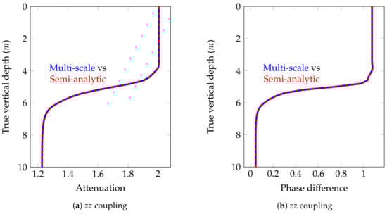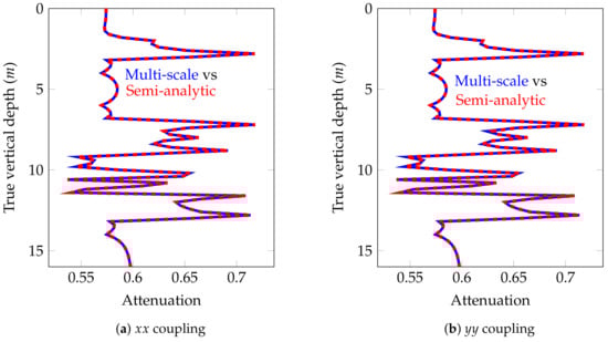 Model problem 2. Attenuations for the non-zero couplings ( and couplings) of the magnetic field for a vertical well (dip angle = ).