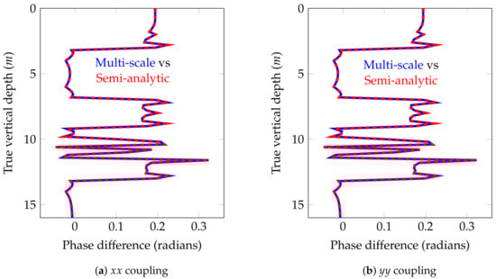 Model problem 2. Phase differences for the non-zero couplings ( and couplings) of the magnetic field for a vertical well (dip angle = ).