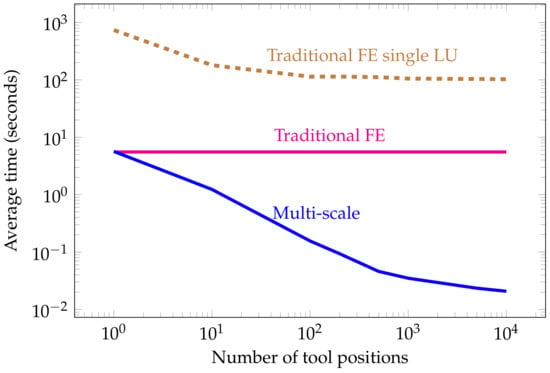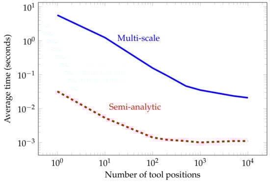 Model problem 2. Average time (in seconds) to solve for one tool position as the number of tool positions varies ().