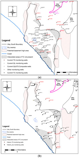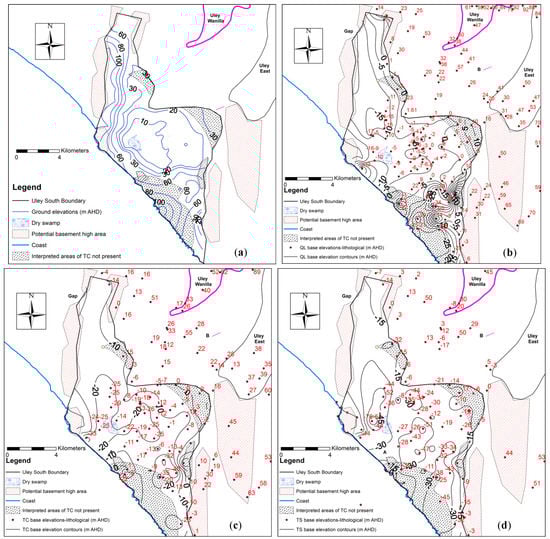 Figure 3 show ground elevations (3a), QL (3b), TC (3c), and TS (3d) base elevations. Ground elevations were derived primarily from surveyed monitoring well elevations supplemented with SRTM [26] elevations in areas where drillholes are not available or very limited.
