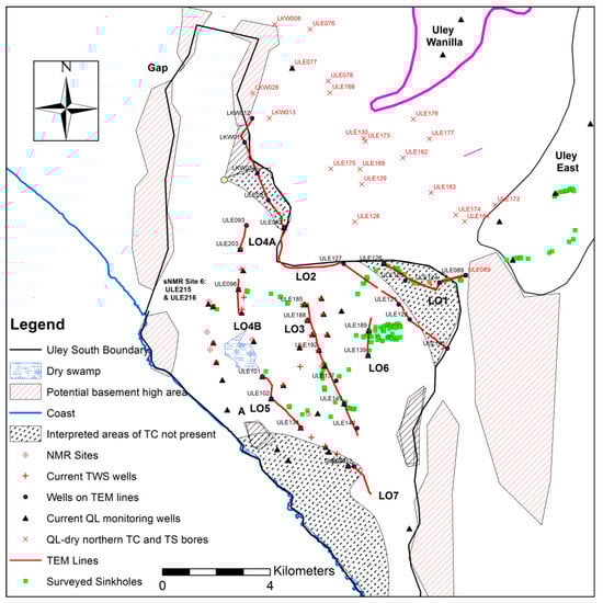 TEM sections LO2-D and LO2-E (Figure 10a,b) display similar low recharge potential characteristics as high resistivity is an indication of presence of dry/cemented limestone. From the ULE092 well (LO2-D) to the LKW012 well (LO2-E), TC is absent. An important feature of LO2 (LO2-A, LO2-B, LO2-D, LO2-E where TC is absent) is that TS water flowing from the north-east direction could flow into QL aquifer as an inter-aquifer leakage. This new knowledge is an improvement to previous understanding of the conceptual model.