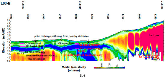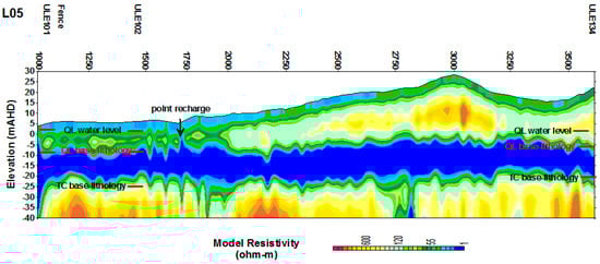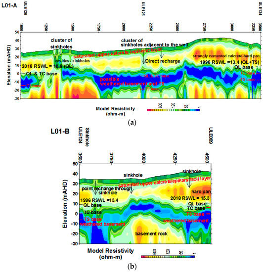 The survey was conducted in May 2017 with the onset of winter (June–August) rainfall, and end of the winter in September–October 2017. The rain was intermittent and hence the most active flow paths, such as; epikarst at and near the ground surface, and sinkholes, received some local surface runoff. Figure 6 shows the inverted resistivity sections for survey lines LO1A and LO1B. Resistivity contrast areas were categorized in to four distinct zones. The upper low resistivity zones of up to 5–8 m depth represent the surface and near surface epikarst zone, which temporary hold water in storage, and either directly infiltrated to the watertable via fissures or was lost to the atmosphere through evaporation. Lower resistivity zones at sinkhole locations are the major recharge points either through sinkholes or from surrounding area. This observation is similar to that observed by Jardani et al. [18] in their study on preferential infiltration pathways through sinkholes. Some of the sinkholes may be filled with debris and silt and some may be buried sinkholes as this is a common feature in the basin. Above the watertable in the QL aquifer, a higher resistivity zone may represent the areas of diffuse recharge through the unsaturated zone as the dry or partially dry limestone is a poor electrical conductor. Resistivity varies with the degree of cementation within the calcarenite as indicated by relative difference of resistivity; where >600 Ωm may be strongly cemented calcarenite than 400–600 Ωm range. Below the watertable, resistivity is typically low as indicated by zones of <150 Ωm, but higher resistivity is also found at some locations due to the presence of strongly cemented limestone. For example, at ULE126 (Figure 6a), the driller’s log indicated that the interval from 15.9 m AHD to—3.9 m AHD, as “Sandstone, hard bars” which are of low porosity and therefore show higher resistivity, even under the watertable. At the time of drilling in 1976, the water level of the well ULE126 was at 12 m AHD.