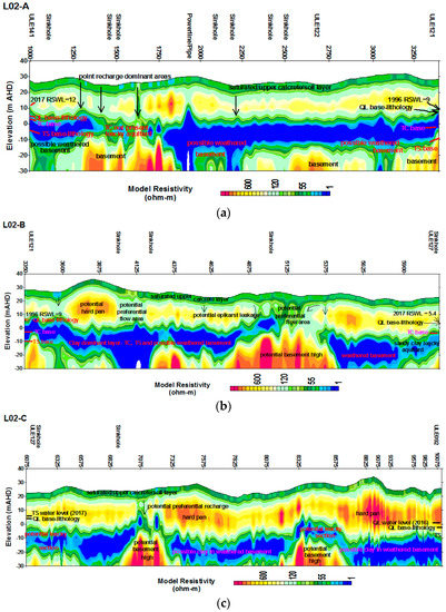 The leakage of TS water into QL forms an important water balance component that is currently unknown to any degree of accuracy. The poor understanding of the landward boundary leakage area is due to limitation of drillhole information. Therefore, the TEM line (LO2) was laid to identify potential reaches of the inter-aquifer leakage as well as other hydraulic factors of the basin such as aquifer elevations and preferential recharge areas along the section. Figure 8 shows the inverted resistivity sections for survey sections from LO2-A to LO2-C.