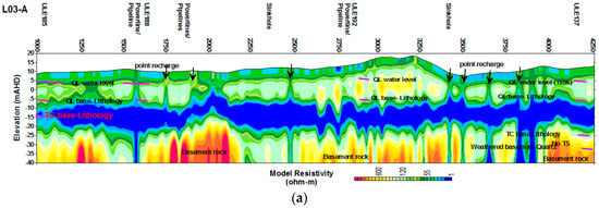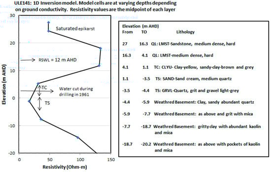 The resistivity range in LO2 is as in LO1, with saturated upper layer and lower resistivity zones appearing in areas of sinkholes. The lowest resistivity zone (1 to 55 Ωm) may represent the weathered basement/clay zones, including silty sand of TS aquifer as evidenced from ULE141 (LO2-A). In ULE141, the description of lithology showed that from the surface to 4.1 m AHD, the QL (hard medium dense limestone) shows higher resistivity above the water level. From 4.1 to 1.1 m AHD as the TC, (which comprised of clay to sandy clay unit) and show low TEM resistivity reflecting saturated clay property. However, according to the lithological description (Quartz sand/gravel) of TS occurs in small sections from 1.1 to −4.4 m AHD that is not particularly identifiable from TEM resistivity. Below this, TEM resistivity increases as the weathered basement contains abundant of mica (Figure 9).