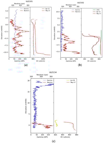 Figure 13 displays gamma, neutron, and EC profiles for ULE101, ULE102, and ULE134 wells. The wells were drilled using cable tool method and therefore there are no records of cavity development from lost circulation during drilling. Gamma logs of wells show uniform vertical counts, with 60 (ULE101), 10 (ULE102), and 30 (ULE134) API (American Petroleum Institute) units indicating the presence of possible clayey limestone. Lithological description in the profile varies between “limestone-soft, limestone and clay, limestone-hard or consolidated limestone”. The neutron readings increased indicating higher porosity zone of the profile, with ULE101 at −2.5, −7.5, and −10 m AHD elevations; ULE102 from 0 to −2.5 m AHD and below −5 m AHD, and ULE134 below 0 m AHD. The higher counts of neutron logs, up to 300 cps (cycles per second) indicate more open limestone and presence of conduit porosities. During drilling, it is noticeable when intersecting a large cavity, but not so noticeable if intersecting a small conduit, unless core samples are collected [24]. As no core samples were collected, it may be difficult to identify conduit porosity zones, particularly small-pipe conduits [24], unless neutron logs are used. This aspect is further elaborated in Section 4.6.