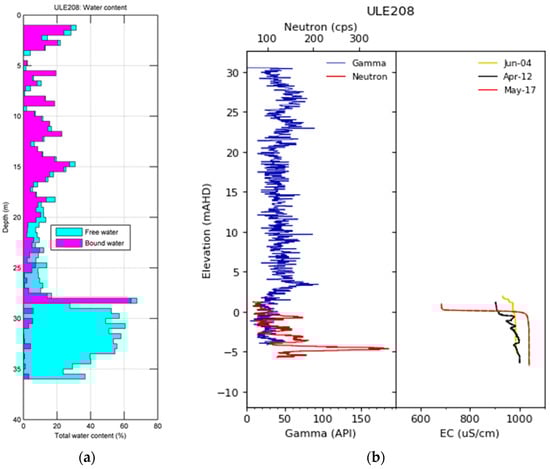 (a) sNMR total water content and conductivity profile at ULE208 [20]; (b) Gamma, neutron, and EC profiles for ULE 208 (surveyed ground elevation 30.5 m AHD).