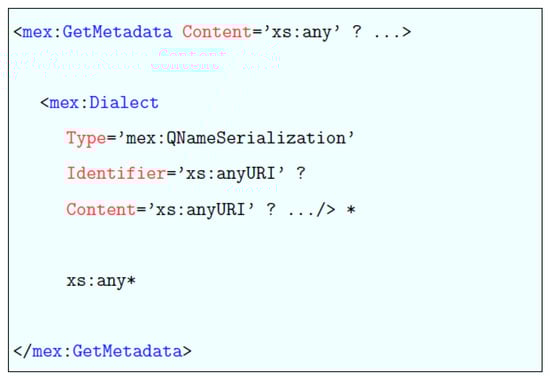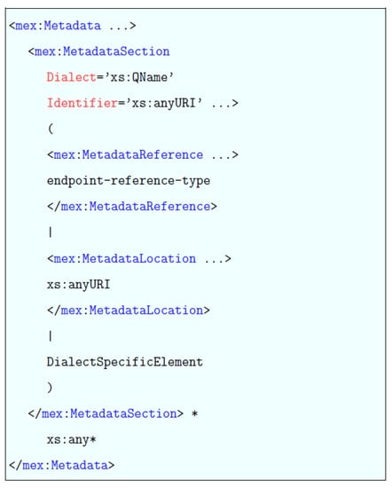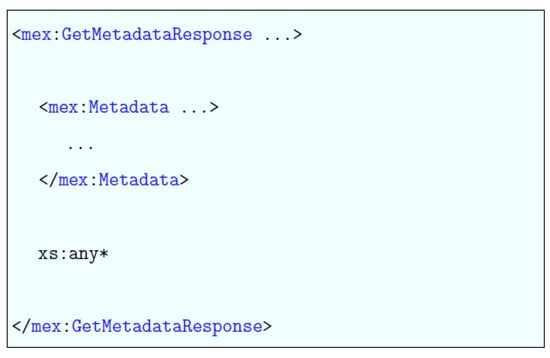 The optional Content attribute specifies the IRI for the request. When absent, the default value is “www.w3c.org/TR/ws-metadata-exchange”. The <Dialect> Element is instead optional and deserves some additional considerations. According to the standard, all of the available metadata have to be returned when this Element is absent. However, when it is included in a <GetMetadata> request, the response has to return only those metadata matching the values specified by the combination of the mandatory Type and the optional Identifier and Content attributes. If no metadata is available for the specified combination, the response must not return any metadata for that Dialect element. Finally, if an Endpoint can accept a GetMetadata request, it has to send a GetMetadataResponse message, whose skeleton is reported in Figure 3.