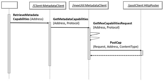 A more flexible alternative to the use of public registries is the acquisition of metadata directly from the intended services. A client can directly interact with a service provider to get the desired information about available services. A requester only needs to know a priori the location where a provider offers metadata about its services and has to agree on a common protocol, the same as with the definition of the public interface and messaging system. This greatly simplifies the task, thus preventing clients from interacting, every time, with proprietary retrieval systems that are offered by services providers []. Flexibility with the typology of metadata that can be retrieved constitutes an additional desirable requirement. In a W3C-based environment, the standard way to directly retrieve metadata about a service is by using the Web Services Metadata Exchange (WS-Metadata) specification that provides a standardized, SOAP-based, way for the encapsulation, insertion, retrieval, and removal of metadata associated with a W3C service []. Although WS-Metadata has not been expressly designed to deal with geospatial metadata in general and OGC metadata in particular, its underlying design choices make it a scalable solution, adaptable to arbitrary forms of metadata.