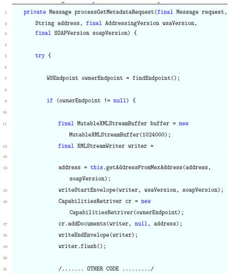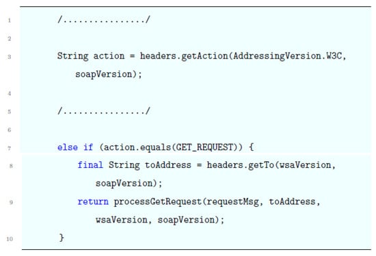 As for the first task, on receiving a GET METADATA request, the original implementation of the invoke() method simply returns a fault message (GET METADATA NOT IMPLEMENTED). Therefore, the initial step in our approach concerned the need to modify the method’s source code by adding the support to properly manage and dispatch such a type of requests (Figure 5).