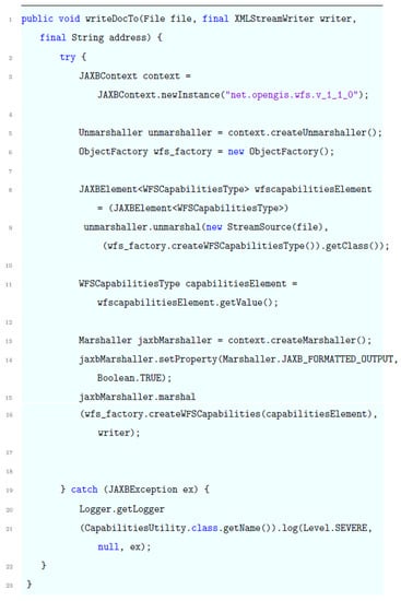 The objects in the tree are instances of the classes that are produced in the binding step. During the unmarshalling phase, it is also possible to validate the source data against the target XML Schema. However, the proper use of the JAXB API (in particular, the use of XJC, the binding compiler of JAXB Reference Implementation) with the OGC XML Schemas represents a challenging task. Major issues to solve include the proliferation of versions of several Schemas, Schemas that are not valid (e.g., GML Version 3) or depend on several others Schemas. Such a complexity makes an OGC Schema difficult to be directly compiled as is. In this context, a support that dramatically simplifies the Java-based implementation of the OGC specifications can be found in the bindings and libraries provided by the OGC Schemas and Tools Project whose aim is to “compile all of the OGC XML Schemas with JAXB schema compiler” []. According to the documentation, the project supports the 1.0.0 and 1.1.0 Versions of the WFS Schemas (the latter being the same as the latest 2.0 version) and the latest versions of the 3.X.X branch of GML (from 3.1.1 to 3.2.1). In this context, the core elements in Listing 4.3 are the JAXBContext, the ObjectFactory, the WFSCapabilitiesType, and the Marshaller classes. The general role of the first class is to provide a customized binding that will provide the necessary information for the marshalling, unamarshalling, and validation phases. The ObjectFactory class contains factory methods for each Java element that has been generated starting from the net.opengis.wfs.v_1_1_0 package. The WFSCapabilitiesType represents the Java class that corresponds to the WFS CapabilitiesType complex type, namely the XML Element defined in the WFS Schema that specifies the structure of the service metadata. Finally, with the Marshaller class the in-memory Java objects are converted into the XML file that will constitute the Capabilities document.