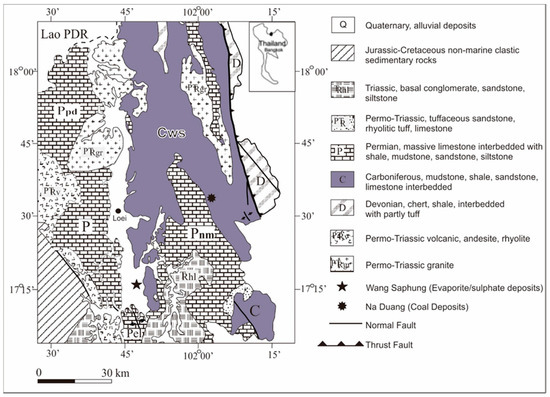 Geological map showing the locations of the Loei-Wang Saphung area (LWS) evaporate/sulfate deposits in the Loei Province, northeastern Thailand (modified after Department of Mineral Resources of Thailand (DMR), 2005) [3].