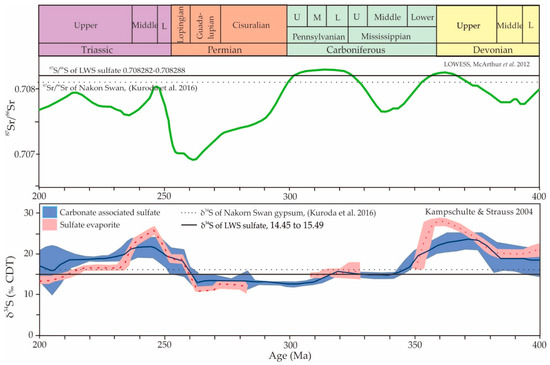 Secular variations of strontium (87Sr/86Sr, middle panel) and sulfate sulfur (δ34S, bottom panel) isotopic compositions in ocean water from 400 to 200 Ma. The 87Sr/86Sr values (green curve) are from Locally Weighted Scatterplot Smoothing (LOWESS) (data compiled by McArthur et al. 2012 [22]), and the δ34S values of carbonate-associated sulfates (blue curve) and sulfate evaporites (red) were compiled by Kampschulte and Strauss (2004) [23]. Horizontal lines indicate the data for the LWS sulfate samples when compared with the Nakon Sawan gypsum samples analyzed by Kuroda et al. (2016) [21].