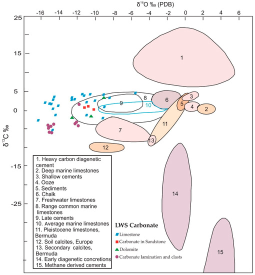 The cross-plots of the C and O isotopes for all samples showed a wide distribution of data, while the δ18O and δ13C cross-plots of the carbonate laminae and clasts within the gypsum–anhydrite beds showed a tendency to negative values. The cross-plots of carbon with oxygen isotopes are useful in determining the origin of evaporitic carbonate [2]. When we compared our cross-plots with the Nammal Formation along the different carbonate rocks proposed by Hudson (1977) [21] (Figure 3), the LWS carbonate rocks fell into the area of common marine limestone.
