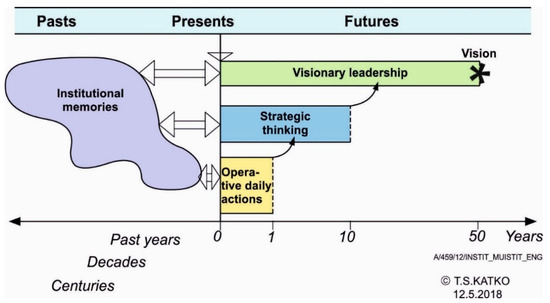 Relationships between the pasts, presents and futures and the timeframe for futures thinking and leadership: From operational to strategic and visionary thinking [13] (p. 253).
