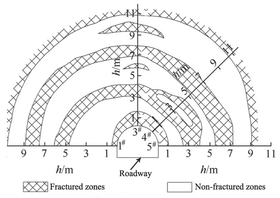 There are four discontinuous fractured zones around the roadway and the shape of the fractured zone is approximately circular. The surrounding rock in the roadway surface area is seriously damaged. This area can be considered as the traditional damage zone. The remaining three damage zones and non-fractured zones appear alternately.