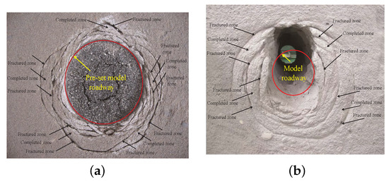 The zonal disintegration phenomenon of model test. (a) Zonal disintegration phenomenon of pre-set model roadway; (b) Zonal disintegration phenomenon of triaxial loading geomechanical model roadway.