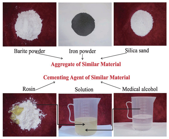 To simulate the mechanical properties of sandstone, a new typed cementations geotechnical similar material called iron crystal sand cementation material (IBSCM) [19,20] was proposed based on the similarity principle and the mechanical parameters of the rock. The iron powder, the barite powder and the quartz sand are selected as the aggregate of IBSCM. Among these components the iron powder and the barite powder are fine aggregates while the quartz sand is coarse aggregate. Its cementing agent is the rosin-alcohol solution (Figure 3). The mechanical parameters of the IBSCM material can be adjusted through the change of the component concentration and the cementing agent solubility.