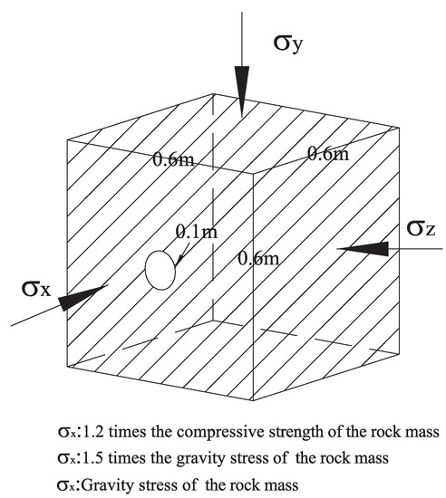 The shape of geomechanical model is a cube, and the size of the model is length (direction of parallel to the roadway axis, x direction) width × (direction of perpendicular to the roadway axis, z direction) × height (vertical orientation, y direction) = 0.6 m × 0.6 m × 0.6 m, the model roadway is excavated using circular holes and the diameter of the roadway is 0.1 m.