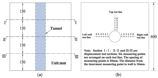 Layout scheme of displacement measurement. (a) Layout of the model monitoring section; (b) Arrangement of the measuring element.