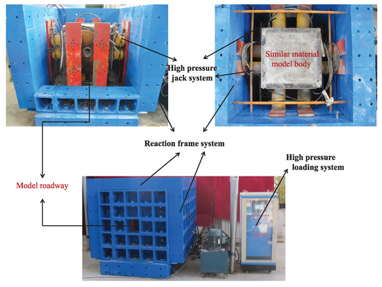 According to the loading method described in Section 2.2, a self-designed high-stress true three-dimensional loading model test system [21] is used to apply boundary load to the model so that the initial stress field is formed inside the model. As shown in Figure 6, the system is composed of three components listed as follows: the reaction frame system, the high pressure jack system and the high-pressure loading system. The high pressure equipment is especially designed in this test and its rated output is 5.5 MPa. There are in total 24 hydraulic jacks respectively set on the six sides of the equipment. The maximum power output of each hydraulic jack can reach 2000 KN. The whole system meticulously simulates the deformation and failure process of the model roadway in Dingji coal mine.
