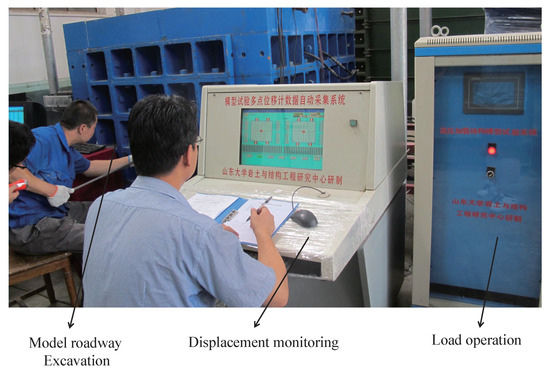 With the complement of the model fabrication, exert the stress at the model boundary according to the similar stress and keep a steady pressure for one day so that an initial high geostress field can be formed inside the model. Full section excavation was adopted and kept excavating the model by stages along the roadway axle until the whole model roadway was cut-through and shaped up [22]. During the process, the deformation and failure of the model roadway should be observed. The test procedure was illustrated and test data of displacement instruments was recorded (Figure 7).