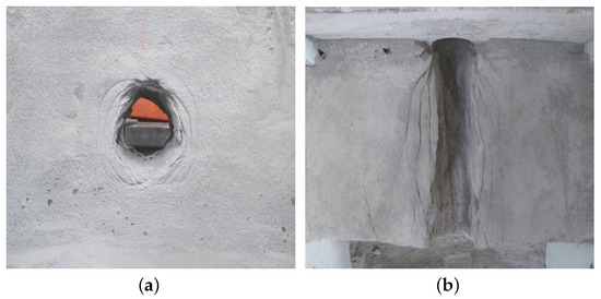 In recent decades, scholars have carried out a lot of research work on zonal disintegration from different perspectives. In theoretical analysis, a non-euclidean analytic model was established to determine the incompatible deformation of zonal disintegration in deep rock masses [2,3]. A strain gradient model was established to obtain the stress field in elastic and plastic zones, and the formation of zonal disintegration of rock mass near deep level tunnel was elucidated [4]. A mechanical model is proposed to investigate zonal disintegration mechanism of cross-anisotropic rock masses around a deep circular tunnel subjected to dynamic unloading under hydrostatic pressure condition [5]. In numerical simulations, the failure mechanism of zonal disintegration around deep underground excavations under tri-axial stress were studied through three-dimensional Realistic Failure Process Analysis (RFPA3D) [6,7], a numerical method based on the UMAT of ABAQUS was proposed to investigate the mechanism of zonal disintegration [8]. In the geomechanical model test, a pre-set roadway model test was implemented to confirm that roadways under a large axial pressure caused the lateral expansion of the wall around circular opening (Figure 2a) [9], a triaxial loading geomechanical model test was used to truly reproduce the zonal disintegration phenomenon and obtained the wave change of strain and displacement with a variety of test methods (Figure 2b) [10].