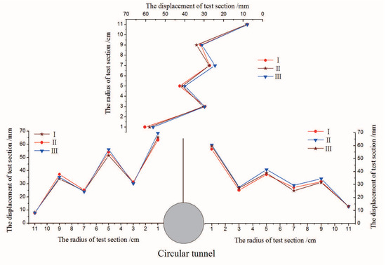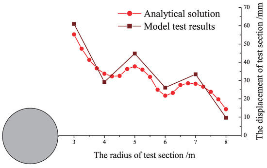According to the radial displacement curve (Figure 13), the radial displacement of surrounding rock shows the oscillation attenuation law. In this attenuation law, the wave peak and trough values appear alternately, and the oscillation amplitude decreases gradually with the increase of the distance from wall. This variation law is consistent with the radial displacement obtained by the model test. In addition, the analytical solution is basically consistent with the model test results.