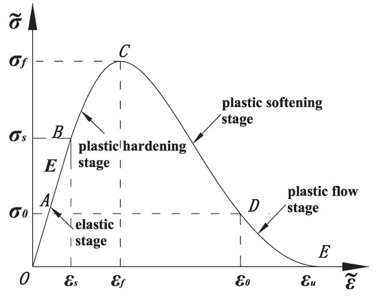 With the increasing depth of underground engineering, the failure of deep rock mass presents the characteristics of ductility and strain softening under the condition of high geostress [29,30]. The equivalent stress-strain curve of uniaxial compression is shown in Figure 10. According to the obvious mechanical properties of post-peak strain softening of rock under deep high geostress condition, the stress-strain relationship is appropriately simplified.