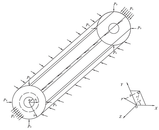 Taking the deep roadway excavated with full section as the research object, the calculation model based on strain gradient is established. The column coordinate system is established: the Z axis is parallel to the axis of the roadway, the plane polar coordinate system is perpendicular to the axis of the roadway. Because the excavation of roadway is a three-dimensional spatial problem, and thus the deep roadway is abstracted into a thick walled cylinder model with infinite length (Figure 11). a is the excavating radius and the inner radium of plastic zone, is the outer radius of plastic zone, b is the outer radius of elastic zone.