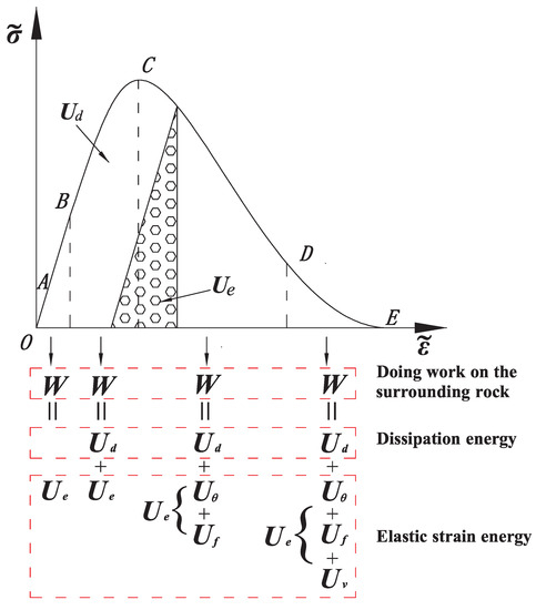 It can be seen from Figure 12 that the work dong on the rock exerted by external force is partially dissipated by the nonlinear internal mechanism of the rock and formed dissipative energy , and the other part is transformed into the elastic strain energy and stored in the rock. After the plastic softening stage, the peak strength is exceeded. A large number of cracks are generated and the cracks begin to penetrate until a macroscopic main crack is formed. The rock deformation mainly manifests as a block slip along the macroscopic fracture surface. When the critical point of failure is reached, the elastic strain energy stored in the rock releases energy in a direction that is easy to release, that is, the direction of the minimum principal stress. When the amount of energy released in this direction reaches the energy required for the rupture of the unit body, the rock unit is totally destroyed. The surrounding rock in the deep cavern is in an elastoplastic state under high geostress conditions. Near the cavern wall, a plastic zone is formed due to plastic yield under high stress, and the elasticity is still deep in the surrounding rock. Both the plastic zone and the elastic zone of the surrounding rock store some of the elastic strain energy .