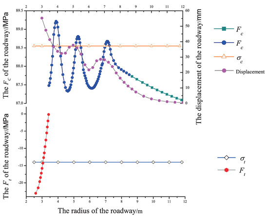After substituting the above parameters into the elastoplastic damage softening constitutive equation (Equation (6)), equilibrium equation (Equation (15)) and the initial and boundary conditions for solving the motion equation (Equations (16)–(18)), the analytical solutions of radial displacement and stresses was obtained by the ODE45 function in Matlab software. Then the failure mechanism of roadway can be analysed by the energy failure criterion (Equations (26) and (29)). The comparative analysis is done with the model test data in Table 4. At the same time, the contrastive curves of radial displacement is shown in Figure 13.