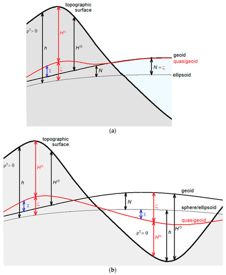 In modern geodesy, an undisputable importance of the knowledge of the disturbing potential at the topographic surface has been emphasized both theoretically, in the work of References [3,25] and others, and practically, especially since the arrival of techniques for mapping Earth’s external gravity field from the analysis of orbital parameters of satellites, and the commencement of dedicated satellite gravity missions. Completely disregarding the topographic density information, Molodensky extended this idea further in the definition of normal heights by replacing the mean value of the actual gravity along the plumb line within the topography by the mean value of the normal gravity along the ellipsoidal normal between the telluroid and the reference ellipsoid. This concept is now commonly adopted in many countries for the definition and realization of vertical geodetic datums. In Helmert’s [26] concept, on the other hand, the topographic density information is incorporated in the definition of orthometric heights by computing the mean gravity along the plumb line within the topography approximately according to Poincaré–Prey’s gravity reduction. Helmert’s concept thus represents reality more closely because of the assumption of an average topographic density. Moreover, knowledge of Earth’s upper continental crustal density has improved significantly in recent years, so that the determination of the actual equipotential geometry inside the topography becomes even more realistic, obviously by also taking into consideration the actual topographic geometry.