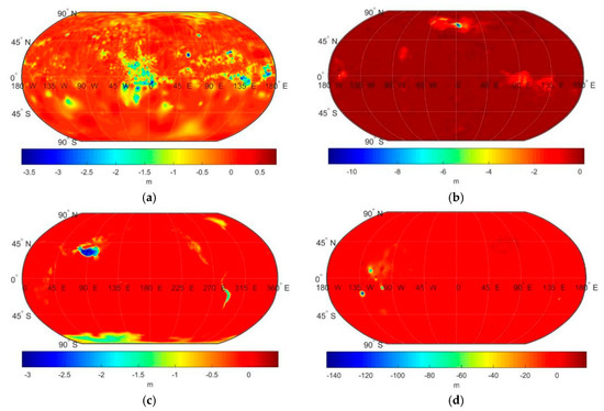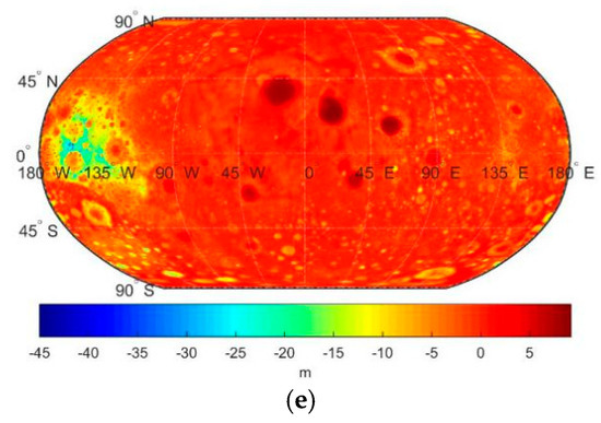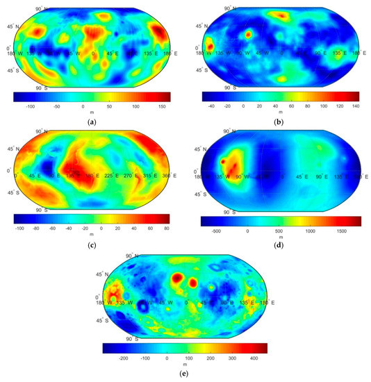Except for some more detailed features, the global quasigeoid patterns on Mercury, Venus, Earth, Mars and the Moon (Figure 2) very closely agree with the geoid patterns on these planetary bodies as presented in Reference [9]. The quasigeoid undulations on Mercury are spatially correlated with major topographic features, having negative values typically in lowlands and positive values in elevated regions (Figure 2a). In addition, the signatures of impact craters could to some extent be recognized. The quasigeoid geometry on Venus is also largely modulated by major topographic features with negative values typically in lowlands. The largest positive values mark the locations of the Alta and Betta Regios volcanic regions and the elevated region of Ishtar Terra (Figure 2b). A prevailing long-wavelength pattern of the quasigeoid geometry on Earth is mainly controlled by deep mantle density heterogeneities (Figure 2c). On Mars, the largest (positive) quasigeoid undulations are in the Tharsis volcanic region with additional localized modifications by the largest volcanic rises of Olympus, Ascraeus, Arsia and Pavonis Mons (Figure 2d). The largest negative values are along the Valles Marineris rift valleys. Large quasigeoid undulations on the Moon are closely spatially correlated with the topography shaped mainly by impact craters (Figure 2e), with the most pronounced maxima in Imbrium and Serenitatis. The largest negative values, on the other hand, mark the locations of the Orientale and South Pole–Aitken impact craters.