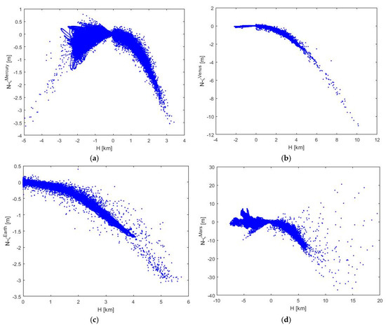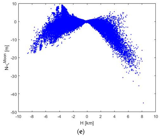 As seen in Figure 3a, the geoid-to-quasigeoid separation on Mercury is typically negative, with extreme values roughly −3.5 m at the lowest and highest elevations. The differences between the geoid and the quasigeoid increases (non-linearly) with elevations as well as depths (Figure 4a). The geoid-to-quasigeoid separation on Venus is mostly negative, with typically small absolute values not exceeding more than 0.5 m (Figure 3b). The values increase (in the absolute sense) with elevation (Figure 4b) and reach extreme values of −11 m in Ishtar Terra. The differences between the geoid and the quasigeoid on Earth are mostly negative, with the largest negative values in mountainous regions of the Himalayas, Tibet and the Andes, and additional more pronounced differences in Greenland and Antarctica (Figure 3c). The spatial correlation between the geoid-to-quasigeoid separation and the topography on Venus and Earth exhibits a similar trend, but on Earth we see much larger dispersion with respect to a prevailing trend. The largest differences between the geoid and the quasigeoid are observed on Mars. Interestingly, extreme negative as well as positive values of the geoid-to-quasigeoid separation are situated at the highest elevations in the Tharsis region (Figure 3d). Nevertheless, the correlation trend between the geoid-to-quasigeoid separation and the elevations is not clearly manifested (Figure 4d). Large differences are also detected on the Moon, with extreme values of −45 m at the elevated rim of the South Pole–Aitken impact crater (Figure 3e). The spatial correlation between the geoid-to-quasigeoid separation and elevations on the Moon is quite similar to that seen on Mercury, with extreme values at the highest and lowest locations (Figure 4e). This finding is not surprising because these differences correspond to potential differences of values computed on the geoid and the topographic surface.