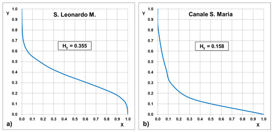 After all, the physical meaning of the stream slope parameters is analogous to the Hy index, that is, the integral of the hypsometric curve representing the distribution of elevations within the catchment [9] (Figure 2). The shape of the hypsometric curve, that can be also parameterized in terms of statistical moments or density functions [45], as well as the value of the hypsometric integral, are indicative of the morphological-evolutionary stage of the catchment, implying the state of equilibrium/disequilibrium between erosion, transport, and sedimentation rates [9,46].