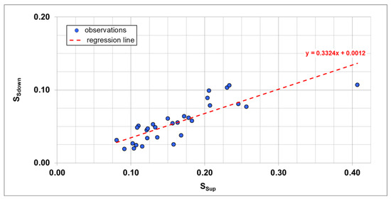 It is to be noted that the selected predictor variables are different from those commonly pointed out as strongly significant, such as the drainage density or the total rainfall. On the other hand, it is obvious to presume that all the computed parameters and variables comprised in the performed analysis hold some link with and physical influence on the sediment yield process, but it could be arbitrary to establish, a priori, which are the most significant. In this regard, the catchment elevation range (Hr), pointed out as mostly significant from the statistical analysis, has its own reason, from the physical point of view, since the higher it is, the higher is the potential energy driving the erosional and transport processes. On the other hand, an indicator of network disorder, such as the density of hierarchic anomaly (Da), which is strongly influenced by the number of anomalous low-order streams, may be associated to the probability of overflooding events (e.g., first-order, non-perennial streams directly draining into main-valley river course, fed by heavy shower and downloading huge amounts of sediments hampering the normal flow) which may justify the negative sign in the relationship with SSY. Lastly, the negative relationship of the stream channel slope ratio (ΔSs), for which an increase in SSY corresponds to a reduction in ΔSs, appears more complex to explain. Basing on how the ΔSs ratio was defined (see Table A1 in Appendix A), a reasonable explanation to this behavior outcomes from the trend analysis of stream slopes in the examined catchments. In fact, in the observed sample, the average slope of upvalley, low-order streams (Ssup) grows more than the average slope of downvalley, high-order streams (Ssdown), as shown in Figure 3. This means that the sediment delivery capacity from hillslope streams grows in parallel, hence, the observed SSY increases accordingly.