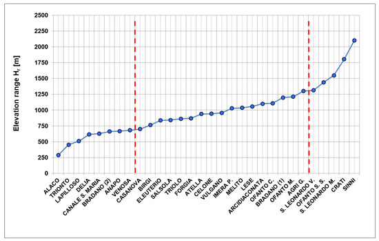 The Figure 4 shows the trend of Hr values, plotted in ascending order. As can be seen, from the distribution of Hr data, three likely homogeneous groups of catchments can be outlined: one on the left extreme of the diagram, formed by catchments with lowest Hr values less than 700 m (from the Alaco to the Venosa catchment); another on the right extreme, formed by catchments with Hr greater than 1300 m (from the S. Leonardo V. to the Sinni river catchment); and the third in the central section of the distribution, given by catchments with intermediate Hr values (from the Casanova to the Agri G. river catchment).