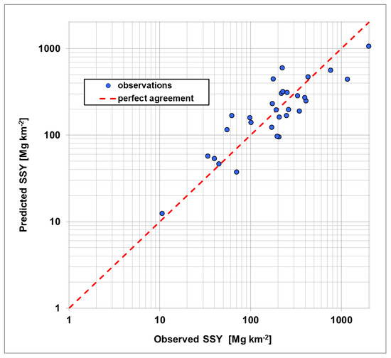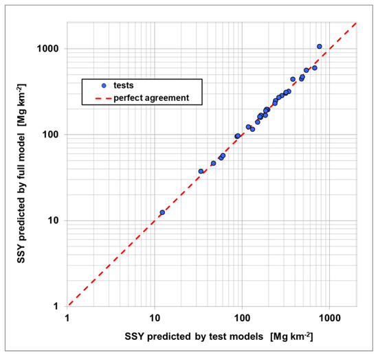 The model robustness was also tested by means of the jackknife technique [54]. Thirty submodels having the same form of the full model (2) were derived in successive steps by leaving out one catchment and repeating the same procedure for each of the 30 catchments. Each of the submodels was then applied to the excluded catchment, and the obtained SSY data were compared with the results from the full model. The comparison is given in the diagram in Figure 6, showing an optimal agreement between the test models and the full model. In this case, an ideal regression line of the two datasets would show a determination coefficient r2 equal to 0.94.