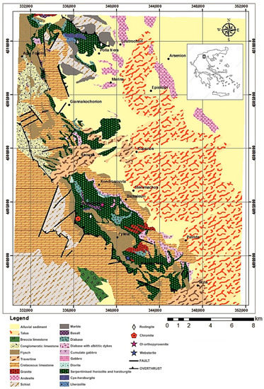 The Veria-Naousa ophiolite complex, located in Northern Greece, belongs to the Almopias subzone of the Axios geotectonic zone (Figure 1). In this ophiolite complex, serpentinized lherzolite and harzburgite, crosscut by scarce pyroxenitic dykes, occur together with gabbro, diabase and pillow basalt, which are considered to be remnants of oceanic lithosphere that have been placed onto Late Triassic–Jurassic platform carbonates of the Pelagonian Zone, from Upper Jurassic to Lower Cretaceous [33,34,35,36]. The serpentinized peridotites are characterized by high tectonic stress, expressed by an intense network of joints. Rare rodingite dykes occur in these ultramafic rocks. Conglomeratic limestones and flysch and breccia limestone of Neogene to Quaternary age lie uncomfortably on the ophiolitic rocks. Granite to granodiorite intrusions are also present. The eastern contact of the ophiolite with the Pelagonian carbonates is dominated by a cataclastic zone of diabasic fragments and albitite cement. Pliocene volcanic rocks of the Almopias subzone ranging in composition from trachyte to andesite occur to the east of the ophiolitic complex.